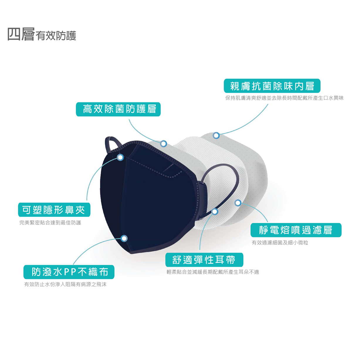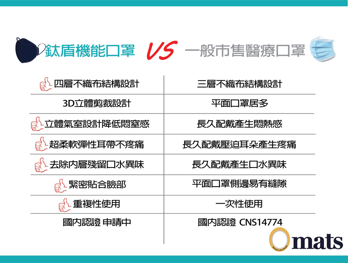 鈦盾機能口罩為結合 Omats 水之盾抗菌系列的新科技產品。 四層不織布具有防水、防灰塵、抗病毒等高效防護。 3D 立體剪裁加大氣室設計,讓使用者呼吸更為順暢,降低悶室感。 另外雙側翼設計,搭配柔軟彈性耳帶,讓口罩能緊密貼合臉部,有效減低臉頰側面縫隙,達到最佳防護。 水之盾抗菌塗層,除了增加抗病毒防護力,並能去除內層殘留口水異味,非常適合需要長時間配戴口罩人員使用,如老師、餐廳服務員、旅館招待員、辦公櫃檯員、超市店員、司機等。而長途旅行者必須身處在封閉的公共交通運輸,鈦盾機能口罩就是最佳選項。無論工作或日常,鈦盾機能口罩都將是人們生活的好夥伴。